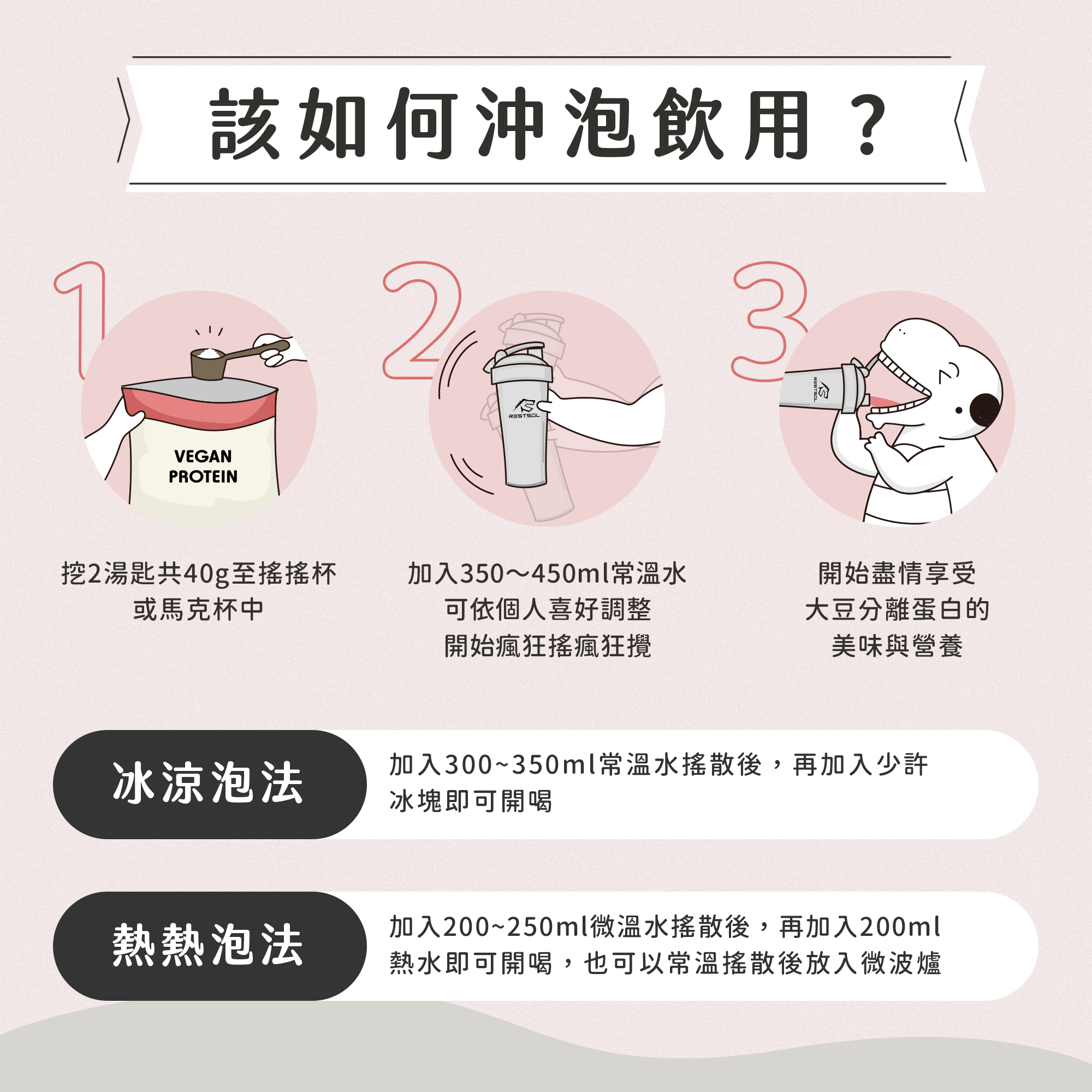 1. 全素植物性蛋白飲,採非基改分離大豆蛋白,安心爽快喝